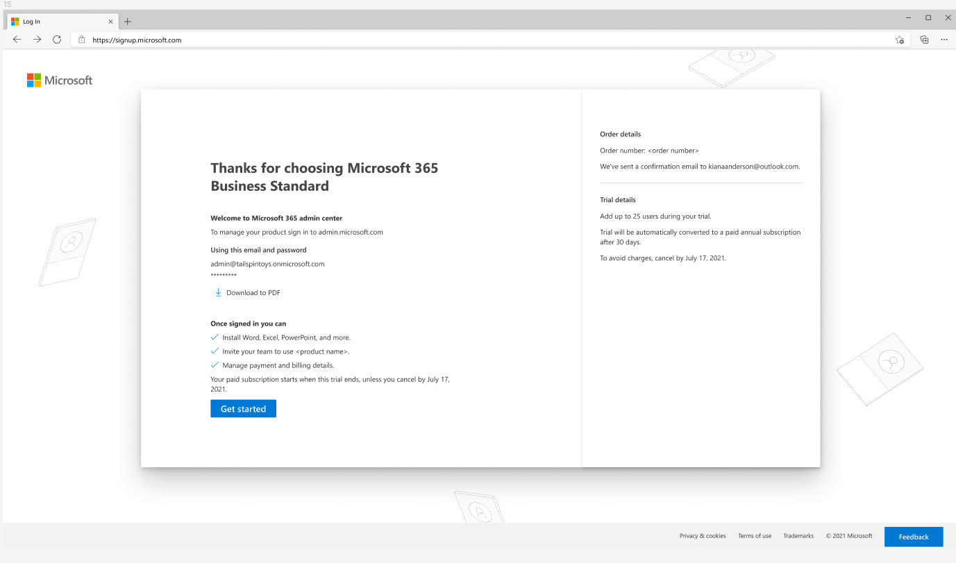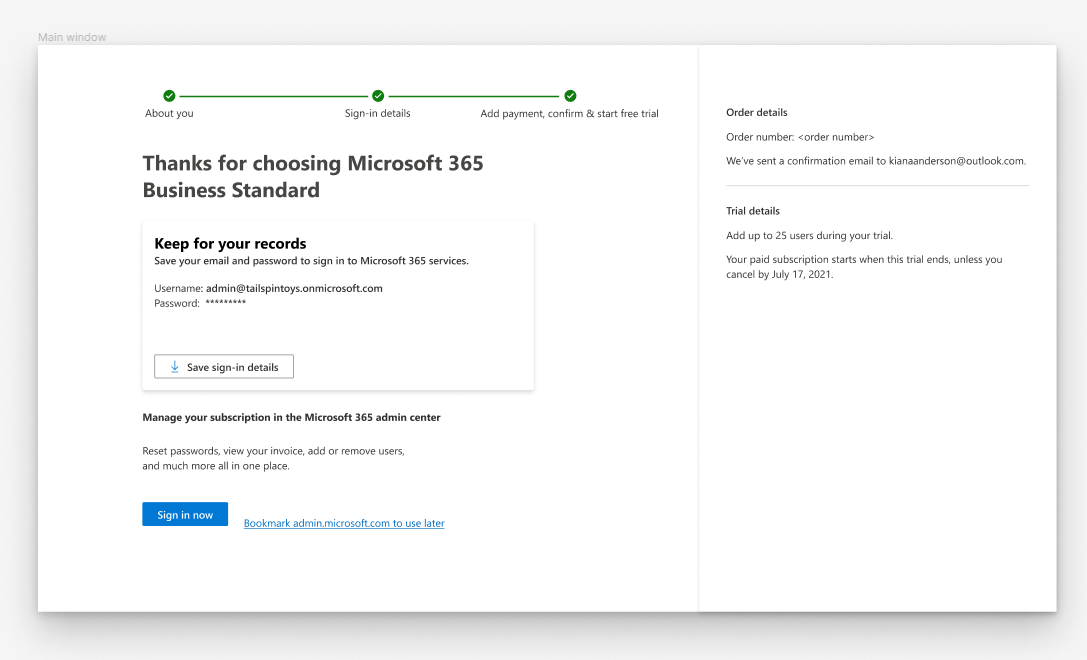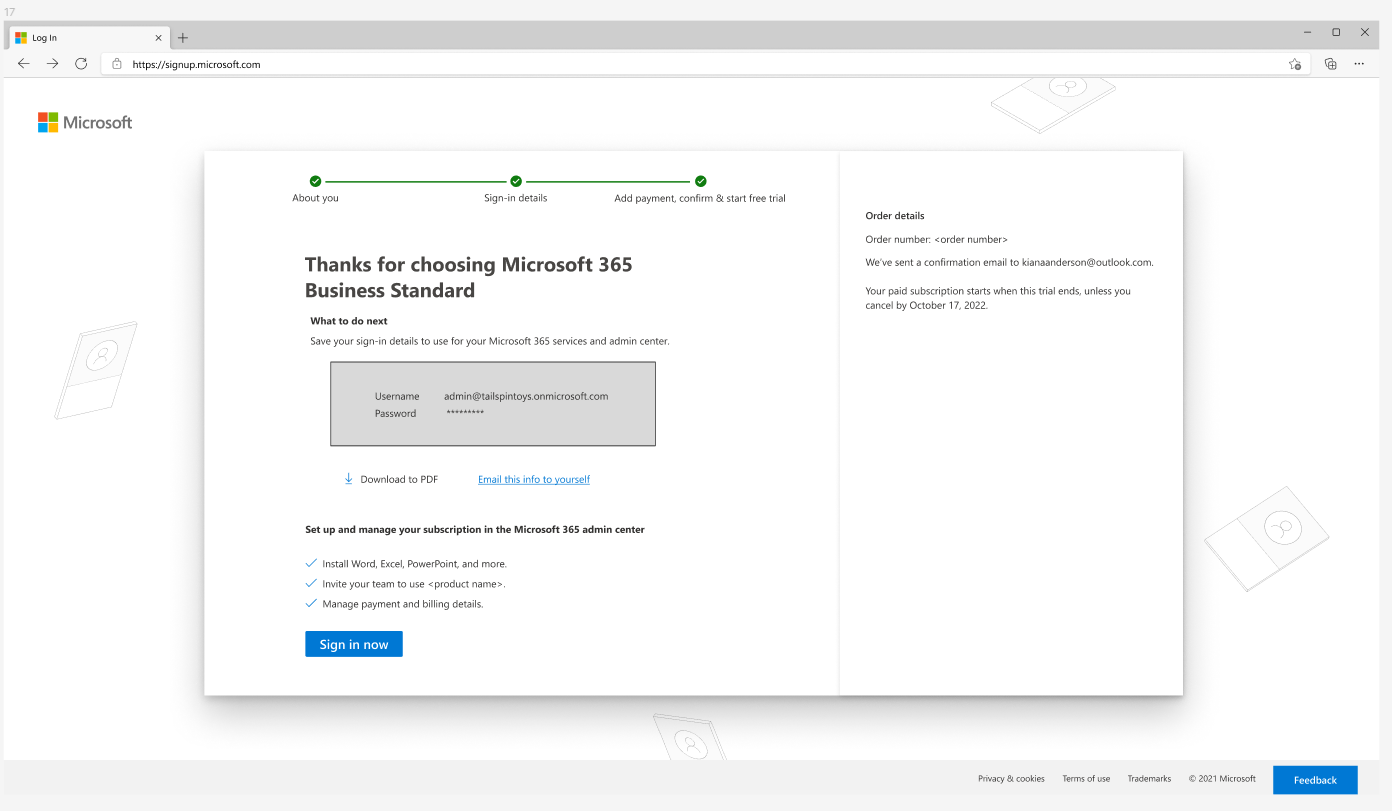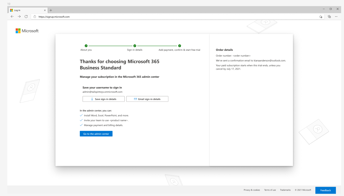 Redesigning the confirmation page a customer sees after they buy a Microsoft 365 subscription to confirm the purchase, provide sign-in credentials, and information for where those credentials are used