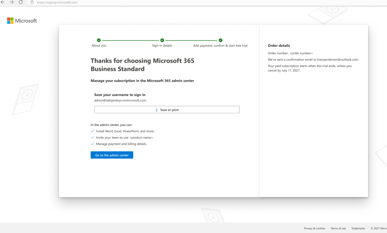 After customers buy a Microsoft 365 subscription (e.g., Microsoft 365 Business Standard), they immediately start using the product. When customers need to sign in to the Microsoft 365 admin center to manage their subscription, they don’t remember having created a sign-in email and password and can’t locate this information when they need it. This resulted in 600 to 700 support calls per month.